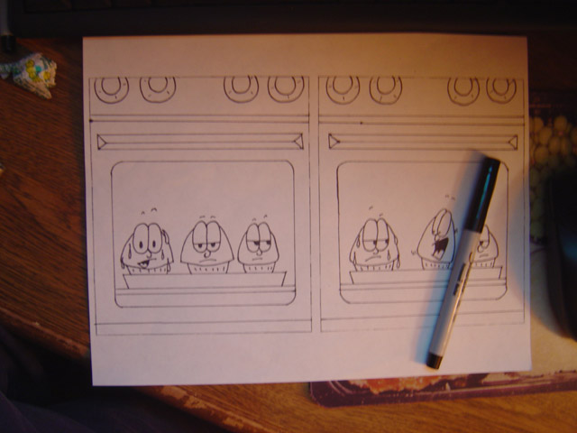 After the nitty-gritty has been duked out, Scott goes off to watch Surface while Lori sits down and draws the strip itself. Nothing real fancy - just your standard pencil and copy paper are used because we figured it'd be easiest to choose materials that are freely available everywhere.